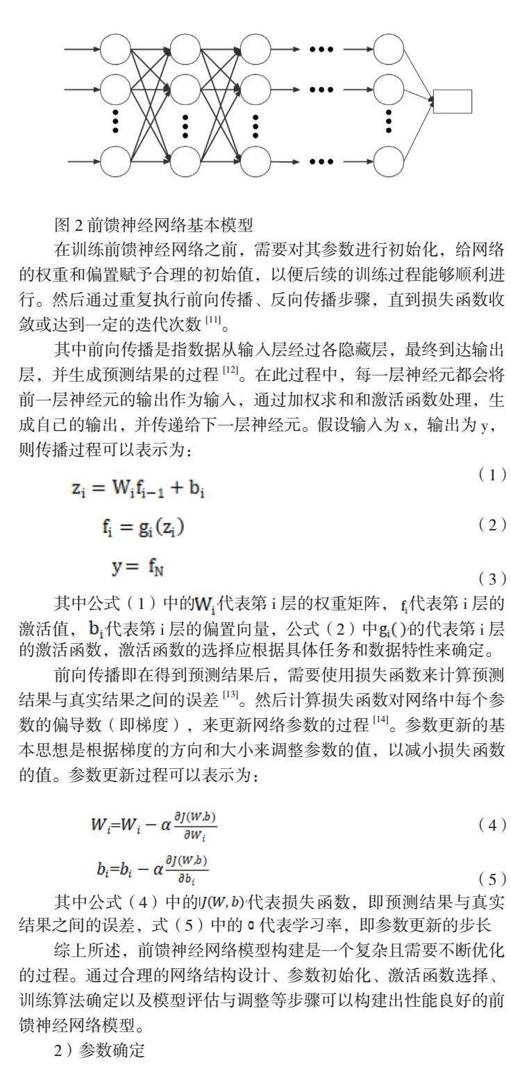 前馈神经网络作为人工神经网络领域的典型模型,其原理基于生物神经元工作,由多层神经元组成,分为输入层、隐藏层和输出层[8]。信号从输入层向输出层单向传播,每个神经元通过权重和激活函数对输入进行加权求和,并输出到下一层[9]。前馈神经网络结构直观,数据处理迅速,结果可读性强,被广泛应用于多领域、多场景中,包括图像识别与处理、自然语言处理、个性化推荐系统等[10]。