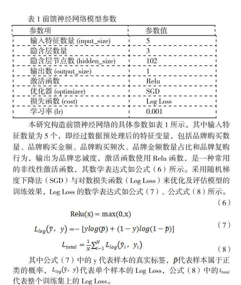 本研究构造前馈神经网络的具体参数如表1所示。其中输入特征数量为5个,即经过数据预处理后的特征变量,包括品牌购买数量、品牌购买金额、品牌购买频次、品牌金额数量占比和品牌复购行为,输出为品牌忠诚度,激活函数使用Relu函数,是一种常用的非线性激活函数,其数学表达式如公式(6)所示。采用随机梯度下降法(SGD)与对数损失函数(Log Loss)来优化及评估模型的训练效果,Log Loss的数学表达式如公式(7)、公式式(8)所示。
