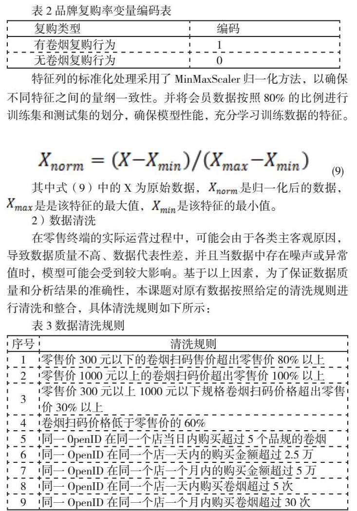 数据获取自会员数据。为了保证研究的可靠性与代表性,提取关键特征列,包括消费者的品牌购买数量、品牌购买金额、品牌购买频次、品牌金额数量占比和品牌复购行为,这些特征用于表示消费者的品牌消费行为模式。其中品牌复购行为指标采取用“1”代表有卷烟复购行为,“0”则代表无卷烟复购行为。