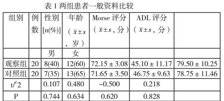 本研究期限为2019年1月~2019年12月,选取此阶段在我科住院的40例患者,按照随机数字表法将其分为观察组20例与对照组20例。观察组男8例,女12例;平均年龄(72.15±3.08)岁;Morse跌倒风险评分(45.10±11.17);生活自理能力(ADL)评分(79.50±10.25)。对照组男7例,女13例;平均年龄(71.65±3.50)岁;Morse跌倒风险评分(46.75±9.63);生活自理能力(ADL)评分(78.75±11.46)。两组患者在性别、年龄、Morse跌倒风险评分、生活自理能力(ADL)等方面无显著差异(P均>0.05),见表1。