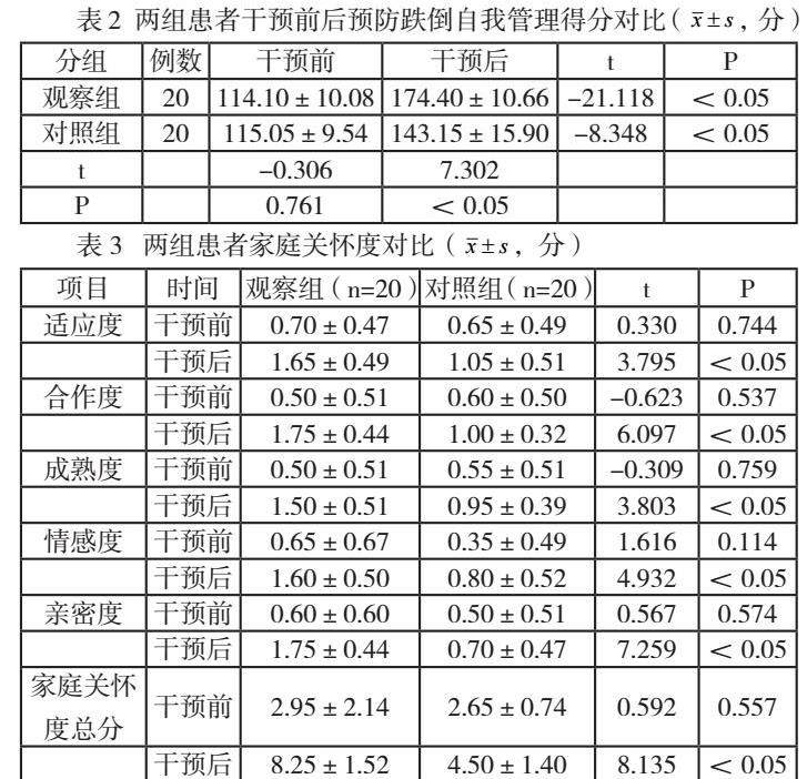 本研究中,观察组患者的家庭关怀度各维度及总得分均高于对照组,分析原因为:一方面,患者家属在院期间接受专业人员的培训后,不但对患者的疾病更加了解,而且对患者的关心度增加,与患者之间的情感及亲密度进一步增加;另一方面,因患者家属知识水平的提高,患者对其信任度提高,增加了他们之间的沟通及交流,提高了合作性,使家庭功能得到改善,与魏丽萍等[13]研究结果一致。另外家庭参与式的护理在患者出院后能继续发挥监督、指导作用,能有效减少跌倒等不良事件的发生,减轻家庭的负担。