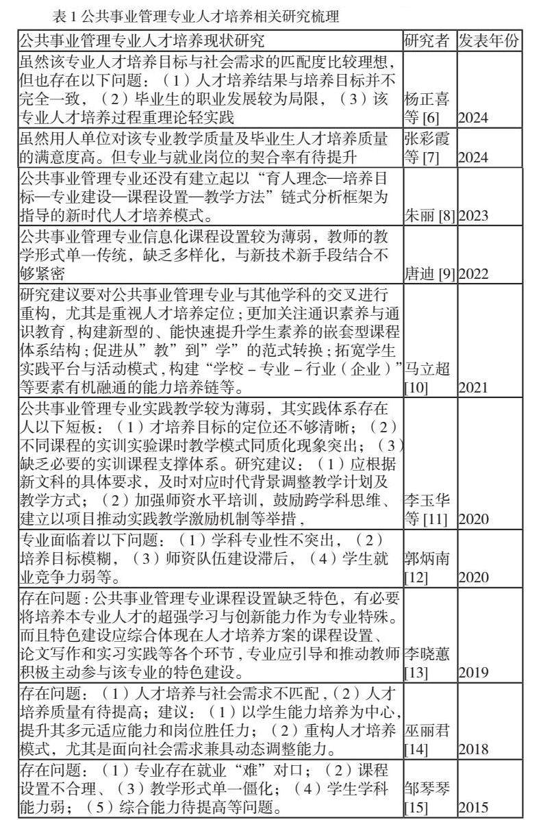 本研究通过文献研究和现状调查两种方式了解公共事业管理专业的人才培养现状。文献研究主要以中国知网和万方、维普等中文期刊数据库为文献来源,依据检索主题,获取相关文献并进行梳理。通过该方法了解国内公共事业管理专业发展的现状及存在的问题,如有研究认为公共事业管理专业的人才培养目标是培养适应国家治理体系和治理能力现代化的人才,从完成情况来看,这一目标的达成度较好,尤其是立德树人培养目标落实情况及学生培养目标达成度两个重要指标较为理想。但该研究的学者也指出当前公共事业管理专业学生毕业后所从事工作与该专业相关度不高、学生职业发展空间存在“天花板”的限制、就业局限性比较明显、实践教学严重不足等现象[6]。还有学者认为该专业目前的人才培养体系没有充分体现“以学生为中心”的教育理念,这导致该专业人才培养目标与结果有着较为显著的差距。另外,学者认为该专业目前人才培养质量评价体系指标与新文科背景下的人才培养要求并没有很好地对应[7]。还有很多学者对该问题进行了较为深入地研究,他们的主要观点被总结在表1进行展示。