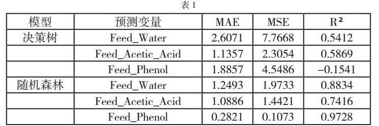 从表中可以看出,随机森林模型在所有预测变量上均显著优于决策树模型。对于进料水含量(Feed_Water),随机森林的平均绝对误差(MAE)为1.2493,均方误差(MSE)为1.9733,决定系数(R²)达到0.8834,表明模型对水含量的预测具有高度准确性。乙酸含量(Feed_Acetic_Acid)的预测也同样表现出色,随机森林的MAE为1.0886,MSE为1.4421,R²为0.7416,显示出良好的预测能力。