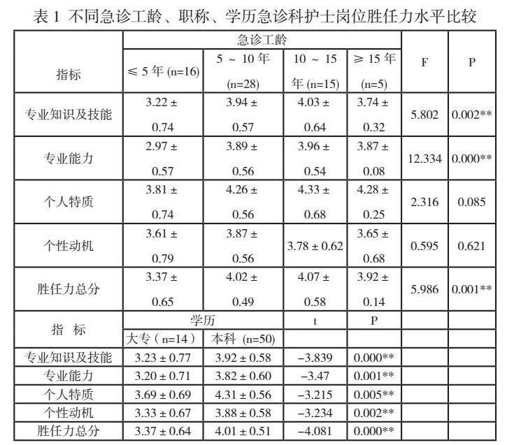 工龄、职称及学历对急诊科护士岗位胜任力有显著影响。