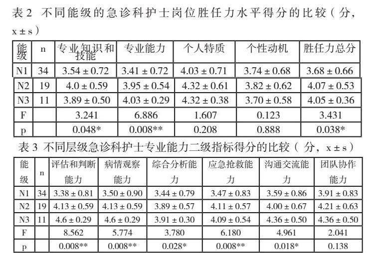 不同能级急诊科护士在岗位胜任力得分上存在显著差异,N2级表现较优(P<0.05)。