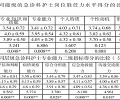 研究标准涵盖了工龄、职称、学历等背景因素,以及专业知识和技能、专业能力、个人特质、个性动机等核心能力。采用5分制评分,分数越高表示能力越强[5]。同时,利用焦虑自评量表和抑郁自评量表评估护士心理状态,分数高意味着压力大[6]。此外,我们还分析了不同能级护士的岗位胜任力,对比了二级专业能力和知识技能,并进行了护士操作技能的培训需求分析,根据护士选择提供培训建议,确保数据量化且详细[7]。