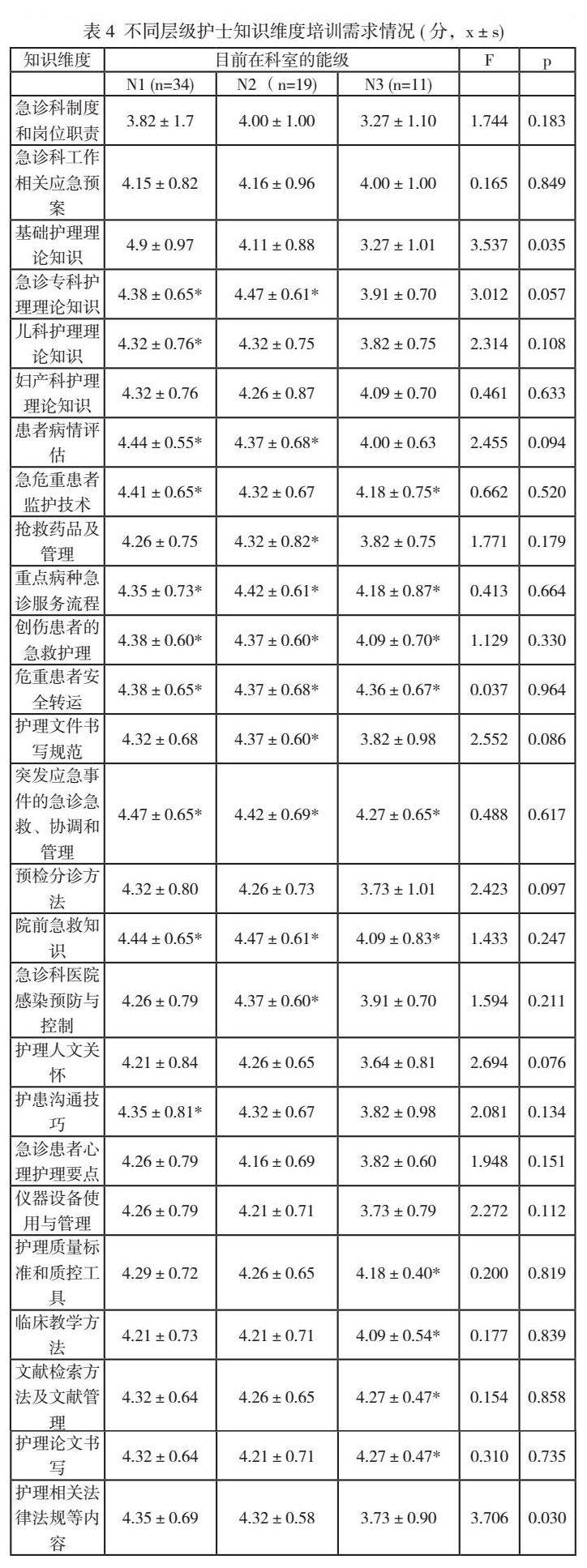 随后,研究了不同层级的急诊科护士在专业能力所具备的二级指标(如评估和判断能力、病情观察能力、综合分析能力等)的得分情况。根据得分结果,进一步探索了这些护士在知识维度和操作技能维度的培训需求,并且进行了详细的比较和分析[4]。再者,收集了64名急诊科护士的反馈,了解了他们希望通过培训提升的能力。