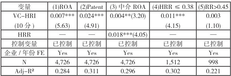 表 2 列 (1) 显示,VC-HRI 每提升 10 分,ROA 增加 0.007( 1=5.63 ),专利提高 2.4% ( 1=4.91 ),H1 成立。控制规模、负债率、城市创业活力后结果稳健。