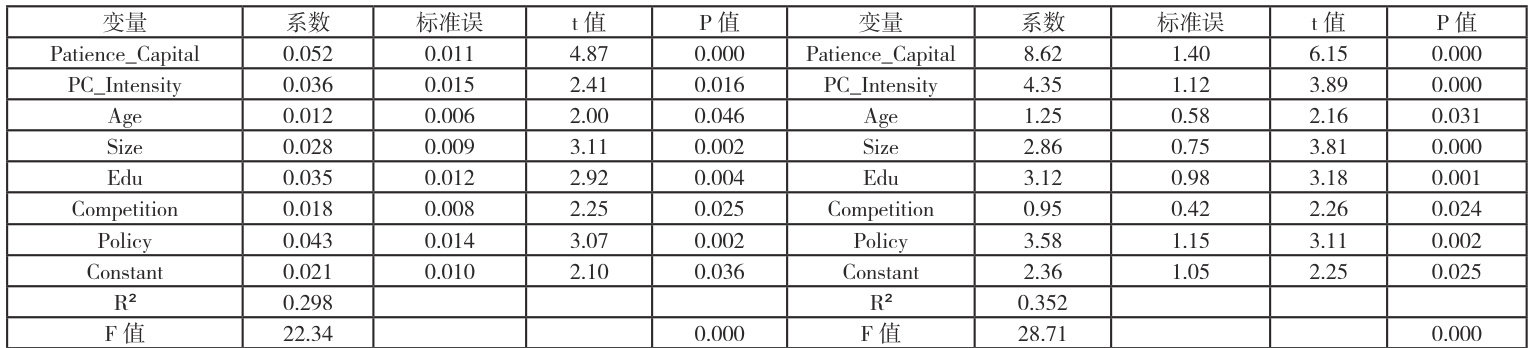 耐心资本对企业长期成长能力的影响:长期成长能力模型结果显示,在控制其他变量后,Patience_Capital 的回归系数为 0.118,且在 1% 水平上显著( 1=5.62 ),表明获得耐心资本支持的企业,其 5 年营收复合增长率比未获得耐心资本的企业平均高出 11.8% ;PC_Intensity 的回归系数为 0.085,同样在 1% 水平上显著( 1=4.35 ),说明耐心资本投资强度每提升 10% ,企业营收复合增长率将平均提升 8.5% 。这一结果证实,耐心资本通过长期资金注入与稳定支持,有效促进了企业的规模扩张与长期成长。
