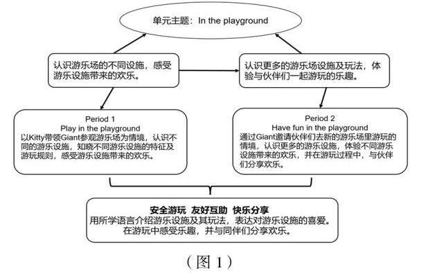 第一课时以Kitty带领Giant在游乐场游玩的场景,认识知晓不同游乐设施的名称、特征,初步感受娱乐设施带来的乐趣以及安全游玩的重要性。第二课时通过Giant和伙伴们在游乐场里游玩的情景,让学生进一步认识了解游乐场的不同设施,并感受与同伴们在游乐设施上一起游玩的快乐。这张单元主题框架图为教学设计提供了清晰的、结构化的育人蓝图,也是对学生各方面能力提升的一个总结。在核心素养的培育中,培养了学生的人生观、价值观和世界观。