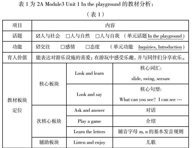 表1为2A Module3 Unit 1 In the playground的教材分析: