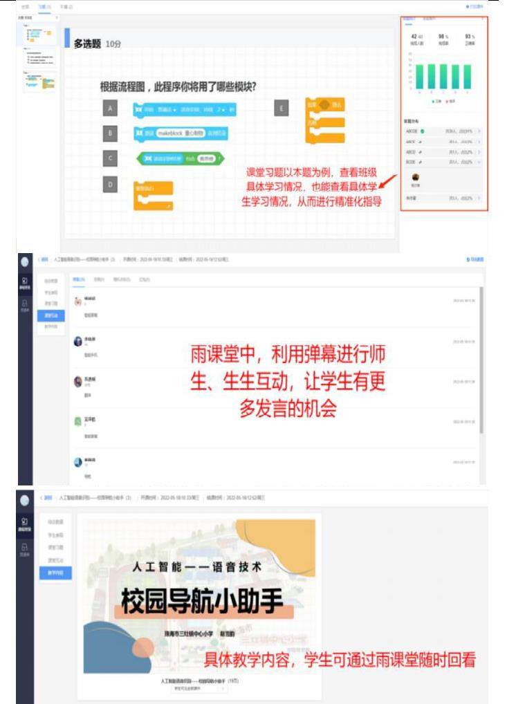 雨课堂平台是一款免费的智慧教学工具,以其智能化,数字化为特性,连接教师的教和学生的学全过程,为教与学提供最大的技术支持。在计算机上安装成功后就成为 PowerPoint上的插件,可以直接打开演示文稿使用。教师可利用雨课堂模块在演示文稿上插入进行多项教学辅助功能,并在课前或课上进行使用。雨课堂微信端或电脑网页端也可以成为学生和教师课外沟学习的桥梁。它将课前——课上——课后的每一个环节都赋予全新的体验,并且支持多屏互动、答疑弹幕、大数据分析等,有利于对学生课前学情分析,课中和课后的精准化、个别化、差异化指导。对于小学来说,其操作的简便性和终端的多样性,是小学信息科技课堂的优异选择。