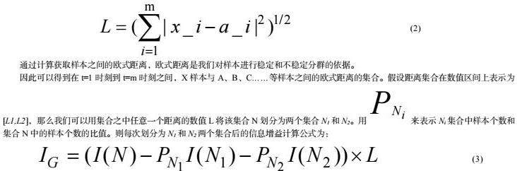 因此可以得到在t=1时刻到t=m时刻之间,X样本与A、B、C……等样本之间的欧式距离的集合。假设距离集合在数值区间上表示为[L1,L2],那么我们可以用集合之中任意一个距离的数值L将该集合N划分为两个集合N1和N2。用来表示Ni集合中样本个数和集合N中的样本个数的比值。则每次划分为N1和N2两个集合后的信息增益计算公式为:
