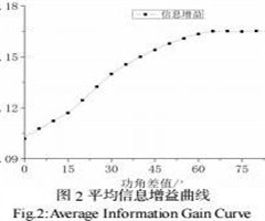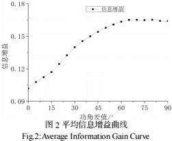 由于提取出来的功角差值参差不齐,所以对99条曲线进行数据提取,从0度开始,功角差值每隔一度,记录一个数据,直至90度。部分稳定样本的增益曲线只能达到四五十度。为统一数据长度,绘制信息增益平均曲线。故对稳定样本达不到的角度,用最后一个记录的信息增益值进行填充,不会改变最终平均曲线递增或者递减的大趋势。绘制的平均信息增益对功角差值变化的曲线如图2。