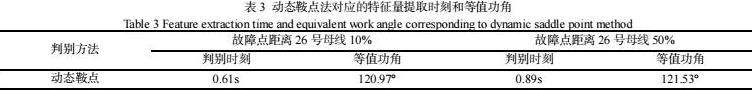 本设计使用功角阈值来提取特征量,功角阈值设置得越大,延迟读取特征量的时间越晚,所以要验证合理地使用功角阈值提取特征量不会太迟以至于错过保护措施介入的时机。设置100%的负荷水平,26号母线和27号母线上发生三相短路故障,故障时间为0.2s,故障点分别位于距离26号母线10%和50%处。对比本文所用方法和传统的动态鞍点法[16]读取特征量时刻的不同。