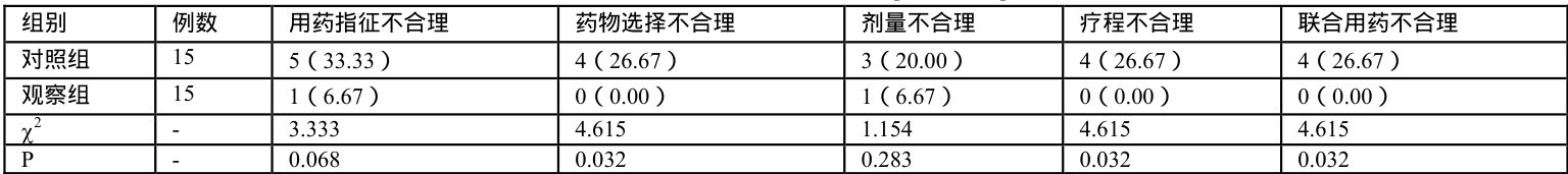 观察两组用药指征合理性、药物选择合理性、剂量合理性、疗程合理性及联合用药合理性。