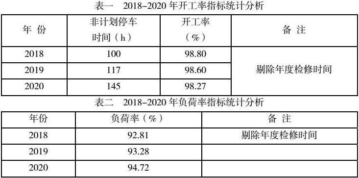 通过综合对比,氯乙烯装置受内外部影响因素耽延有效生产时间,造成2020年整体开工率较2018、2019年降低0.33~0.53%,且氯乙烯装置的整体负荷率指标(表二)尚显不足,所以迫切需要从内部着力挖潜提升装置开工率和负荷率,进而保障预期目标的达成。