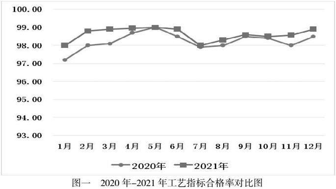 3、工艺管控更精益。严肃工艺管理和考核,提升工艺指标偏离后追责的严肃性,进而提升员工对于工艺指标的敬畏心里。一是工艺技术人员持续提升自身技能,操控过程中发现短板或存在不足时针对专人进行答疑解惑,同时根据工艺报表及DCS曲线寻找各班组控制的规律,让控制较好的操作工讲解技巧,传授其他操作人员,实现共同提高的目的。二是工艺指标调整与控制、问题纠偏与总结、员工操作技能提升等多个方面作为切入点,采取“内外操互教互学”“师带徒”等方式弥补运行短板,采取“不放过任何一个异常参数”来及时优化工艺控制,助推管理工作精益求精。三是提高工艺指标的管控力度,出现异常指标在填写纠偏记录的同时及时进行调控,且根据各班组控制情况与当月的班组竞赛得分挂钩,提高工艺纠偏及时性以及提升工艺指标合格率(见图一)。