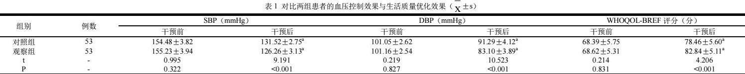 干预后观察组患者的SBP、DBP水平低于对照组,且观察组患者的WHOQOL-BREF评分高于对照组(P<0.05)。