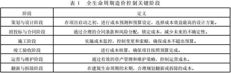 全生命周期造价控制是指从建筑项目的概念设计阶段开始,一直到建筑物的拆除或翻新,对整个生命周期内的成本进行预测、规划、控制和优化的过程。这种控制不仅包括建设成本,还涵盖了运营和维护成本,以及最终的拆除或翻新成本[2]。全生命周期造价控制的关键阶段如表1所示。