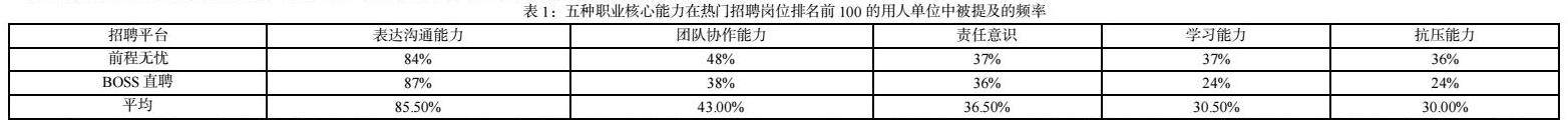 职业核心能力,简言之,是指个体在职业和日常生活中,除了特定专业技能外,为了取得个人和职业成功所必须具备的一系列基础能力。职业核心能力之所以重要,是因为它们贯穿职业生涯的始终,决定了劳动者在职业道路上的高度和广度。无论从事哪个行业或职位,这些核心能力都是不可或缺的。事实上,许多经济活动和管理行为都围绕这些核心能力展开。因此,提升职业核心能力不仅是职场人的长期任务,对于大学生求职就业同样至关重要。根据2024年3月至4月期间前程无忧与BOSS直聘等头部招聘平台发布的招聘需求统计,搜索管理类相关专业应届毕业生招聘岗位,去除重复项后共筛选出212条招聘信息。对数据进行统计分析后发现,对于管理类专业应届高校毕业生,用人单位在招聘时被提及频率最高的前五项职业核心能力依次为:表达沟通能力、团队协作能力、责任意识、学习能力、抗压能力。其中,表达与沟通能力被两家头部招聘平台提及的频率平均高达85.5%(表1)。表达与沟通能力成为管理类专业高校毕业生必须具备的“刚需”职业能力。