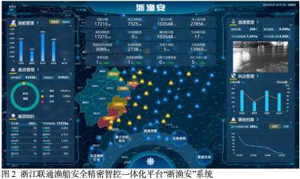 信息技术发展日新月异,各行各业数字化转型已是必然趋势,云计算、大数据也成为企业数字化转型的关键所在。为准确把握行业需求,中国联通打造“联通云”服务品牌,覆盖中国境内100+及境外40+热点地区,提供行业云、边缘云及多云三大服务。同时,中国联通在国内率先建立了中央企业级的“大数据”体系,该体系在大数据、人工智能、区块链等前沿科技领域进行了深度融合与服务创新,构建了一整套成熟的技术架构和运营机制。近年来,中国联通依托云网优势,整合生态资源,形成了“一朵云、两张网、三平台”的工业互联网产品能力体系,结合多款自研应用产品,形成完整的端到端产品体系,赋能千行百业数字化转型升级。目前联通云、大数据已经在数字经济、数字政务、数字社会等多个领域实现落地实践。以浙江联通为例,他们开发的“浙渔安”系统,是一个针对渔船安全的精密智能控制一体化平台(如图2所示)。该平台依靠卫星宽带通信网络,成功将“宽带入海”的理念应用到渔船上,达成了海陆之间的全面互联。这不仅显著增强了渔船的风险防范能力,还大幅提升了应急救援的保障水平,成为解决海洋渔业安全管理难题的重要手段。