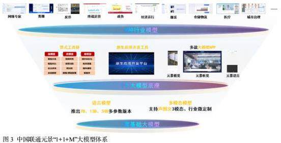 随着科技的迅猛进步,人工智能已经逐渐成为推动经济发展的新引擎,为产业创新注入了强大动力。中国联通积极响应这一趋势,发布了《人工智能战略》,该战略从智能计算能力、大模型研发、数据采集及应用安全等多个维度进行了全面规划。为进一步加强人工智能领域的研究与应用,中国联通在北京成立了“人工智能创新中心”,旨在将人工智能打造成为推动企业高质量发展的核心驱动力。在基础设施建设方面,中国联通创新性地提出了“1+N+X”的智算体系架构,即构建1个超级智算中心,N个智算一体化枢纽,以及X个智算推理节点。在大模型体系的建设上,中国联通推出了元景“1+1+M”大模型体系,这一体系包含一个基础大模型、一个大模型平台以及超过十个针对重点行业的大模型(如图3所示)。目前,已在政务、工业、服装等行业取得阶段性实效。例如在雅戈尔服装制造工厂,利用5G+AI、机器人等应用进行视觉检测等,提升检测效率和质量,使雅戈尔的量体定制周期从原来的15天缩减到5-7天,单工位生产效率提高25%。在2024年的全国两会上,政府工作报告明确提出“人工智能+”行动,中国联通积极响应和落实“国家人工智能+”行动,在今年的战略文化优化升级中,也将人工智能创新行动计划列为重点发展的9大行动计划之一,人工智能也成为中国联通布局未来产业的重要战略方向。