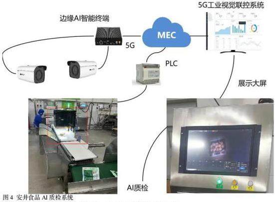 随着5G、物联网、人工智能等技术的广泛应用和不断完善,边缘计算市场也迎来了蓬勃发展的新时代。在智能制造过程中,海量的实时数据不断生成。然而,传统的云计算模式在数据传输时延、带宽需求等方面存在明显不足,难以满足对实时性的高要求。边缘计算技术的出现,有效地解决了这一问题。它将计算和数据处理任务分配给靠近数据源的边缘设备,从而显著降低了数据传输和处理的时延,大幅提升了数据处理效率和响应速度。这一技术的广泛应用,为工业自动化领域带来了更多的可能性和创新空间。在边缘计算领域,中国联通坚持自主研发路线,推出5G边缘计算平台,提供“边缘能力供给”和“集约支撑服务”。截止到2024年3月,中国联通已经完成全国首张大规模节点(600+)MEC商用网络建设,与全国十多个垂直行业1000多个客户开展MEC边缘云合作,在智能制造、智慧医疗、智慧园区等领域孵化了数百个MEC商用标杆案例。例如在厦门安井食品,厦门联通打造的“基于5G边缘计算智能生产质检解决方案”(如图4),借助机器学习、5G、AI识别、深度学习、自动剔除等技术手段,实现产品智能在线检测;通过边缘计算和深度学习实现对产品外观和物理属性的即时监测、全程追溯和实时安全监测,为安井食品提供了更高效、智能的生产管理体系。