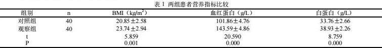 1.3观察指标:比较两组患者的营养指标:包含体质指数、血红蛋白、白蛋白指标。