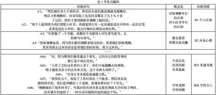 本文一共有29个样本,本文录音资料转成文本共59546个字,随机抽取25个样本进行模型建立,对原始语句赋予A1、A2等编码;对表达相似的概念进行整合;将出现两次以上内涵和意思相同或相近的概念进行归类,然后范畴化,同时赋予编码B1、B2等。最终经过整理提取出“循环传承”、“记录美好生活”、“朋友推荐”“看朋友玩有趣”、“传统媒体”、“内容丰富等68个有效的初始概念,归类出“从众心理”、“内容建设”、“性格爱好”、“个人特质”等26个初始范畴。如表1所示。