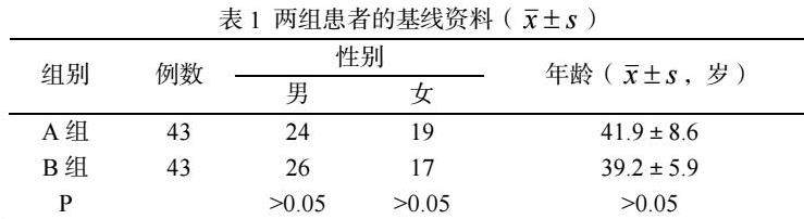 本文的研究对象为医院收治的烧伤患者,研究时间为2022年1月~2024年5月,将研究划分为两个阶段。研究第一阶段为2022年1月~2023年2月,科室在这一阶段选择了43例烧伤病例,并将患者都纳入研究组A组。为保证研究的可比性,科室在2023年3月~2024年5月再次选择了43名患者,将所有患者纳入B研究组,利用马斯洛需求层次理论改进常规的手术室护理干预,并对患者实施心理疏导,两组患者的基线资料见表1。
