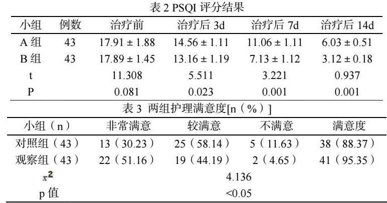 PSQI评分结果显示,治疗前两组的睡眠质量较差,PSQI评分的组间差异偏小(P>0.05);干预后3d、7d、14d,两组的PSQI评分显著下降,说明患者的睡眠质量得到了一定程度的改善,在干预后的每一环节均为B组PSQI评分显著低于A组(<0.05),见表2。