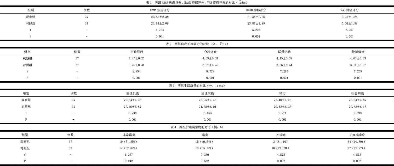 本研究需观察两组的心理状态、疼痛情况、自我护理能力、生活质量、护理满意度进行评价。在心理状态的评价上,使用HAMA焦虑量表和HAMD抑郁量表进行评价。在疼痛情况的评价上,使用VAS疼痛评分进行评价,得分越高疼痛越强烈。在自我护理能力的评价上,根据正确用药、合理饮食、适量运动、控制情绪的情况进行评价,每项满分5分,得分与自我护理能力成正比。在生活质量的评价上,使用生活质量表SF-36评分进行评价,分别从生理机能、生理职能、精力、社会功能四个维度进行评价。在护理满意度的评价上,使用自制满意度调查问卷表进行评价,满分100分,得分90-100分为非常满意,80-89分为满意,80分以下为不满意。护理满意度=(非常满意+满意)/所有患者×100%。