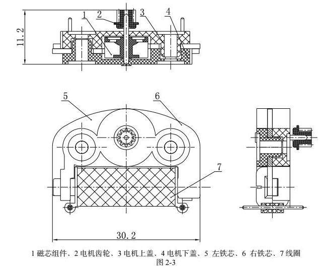 电机组件制成一个整体的部件,具体见图四所示:电机是由电机上盖、电机下盖、磁芯组件、电机齿轮、左铁芯、左铁芯、线圈等组成,见图(2-3)该电机组件的特点是: