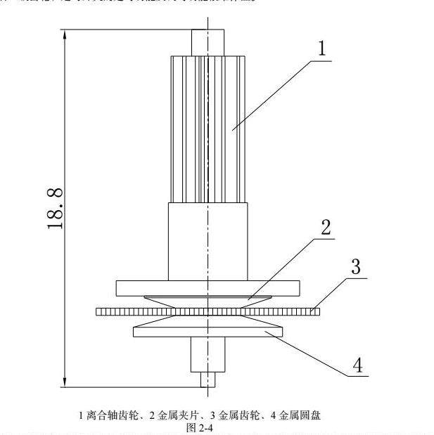 原装AH711离合装置的结构如图2-4所示,它是由离合轴齿轮、金属夹片、金属齿轮、金属圆盘组成,靠金属圆盘和离合轴齿轮铆合后将金属圆盘、金属夹片、离合轴齿轮、金属齿轮四者压紧而成,用离合轴齿轮和金属齿轮的磨擦力来起离合作用的,这种结构很不可靠,离合轴齿轮和金属齿轮的磨擦力大小很难控制,磨擦力大了用手无法转动定时开关的透明秒盘,磨擦力小了电机产生的力距不能从离合装置前一级齿轮能正常传递到离合装置后一级齿轮,定时开关的走时功能及调时功能很难保证。