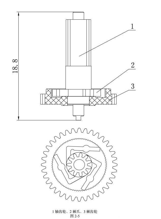 如图2-5所示:棘轮组合离合装置是由棘轮和轴齿轮组成,棘轮有三个成120°分布的棘齿,和轴齿轮内齿圆配合时有单相转动功能,即能把电机产生的力距从离合装置前一级齿轮能正常传递到离合装置后一级齿轮,而不能把因人为调整定时开关时间产生的力距从离合装置后一级齿轮传递到离合装置前一级齿轮。可靠的保证了定时开关的走时功能及调时功能。