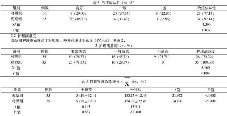 观察组治疗依从性高于对照组,差异有统计学意义(P<0.05),见表1。