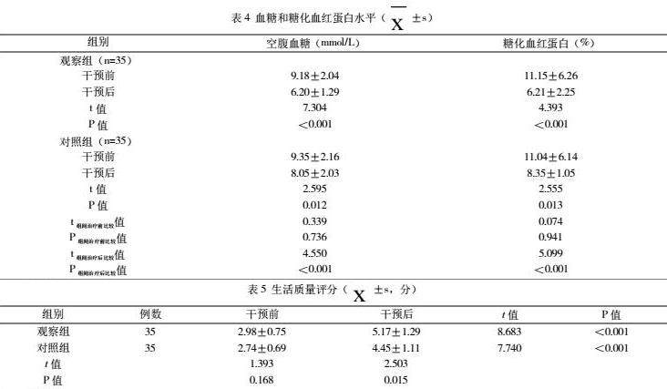 干预前两组血糖水平比较,差异无统计学意义(P>0.05);观察组干预后空腹血糖及糖化血红蛋白水平均低于对照组,差异有统计学意义(P<0.05),见表4。