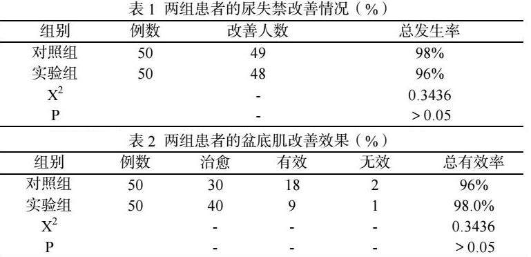 尿失禁改善率实验组等同于对照组,P>0.05。