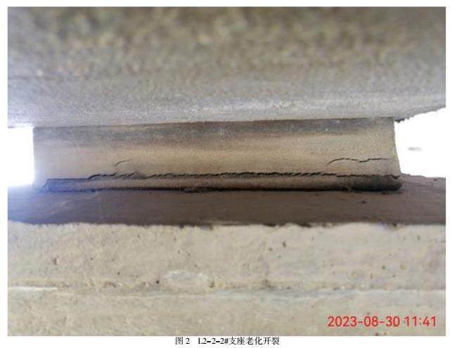 橡胶支座的老化和变形也是常见的病害之一。随着使用年限的增长,橡胶支座在梁体自重及车辆荷载的共同作用下,会出现老化开裂、剪切变形等现象。这些病害不仅影响了支座的耐久性,还可能对桥梁的整体稳定性造成不利影响。如图2所示为支座老化示意图。