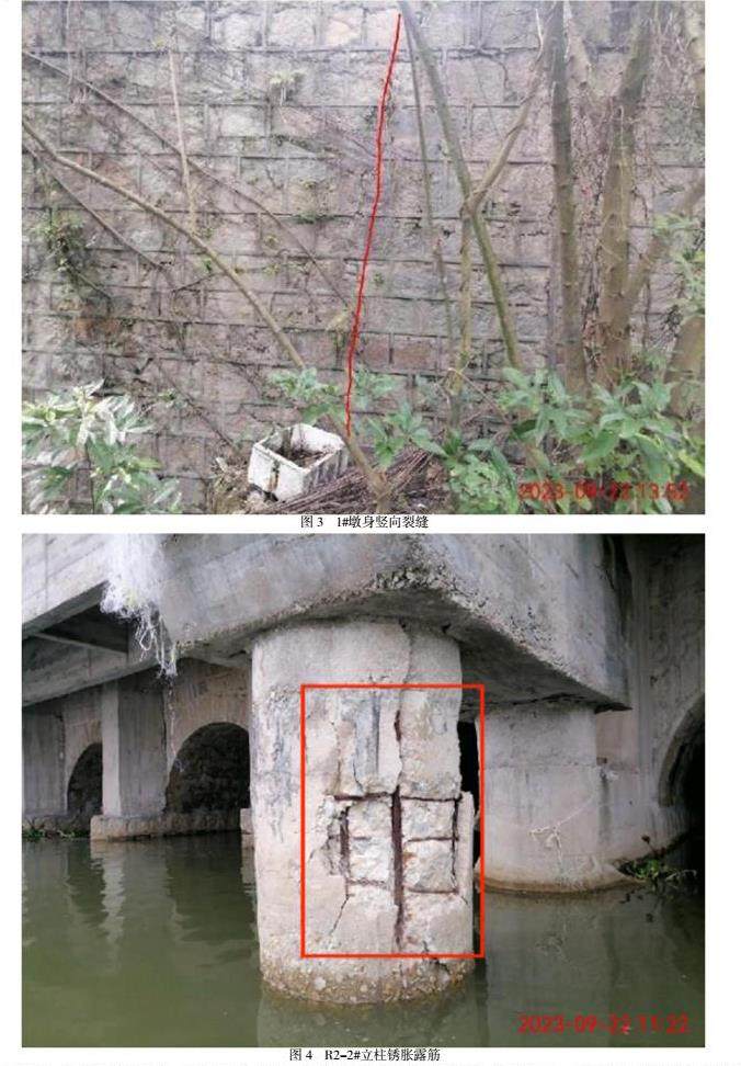 墩身作为支撑上部结构的重要构件,常因基础竖向不均匀沉降和长期车辆反复荷载作用,产生竖向裂缝。例如,重力式墩身可能因基础问题而出现竖向裂缝,而混凝土盖梁则可能因截面尺寸偏小或钢筋配置不足,在跨中承受正弯矩和墩顶承受负弯矩时产生竖向裂缝。此外,混凝土保护层厚度不足也会导致钢筋氧化,进而引起混凝土胀裂和剥落,形成锈胀露筋等病害。其中,1#墩身竖向裂缝(图3)和R2-2#立柱锈胀露筋(图4)尤为典型。