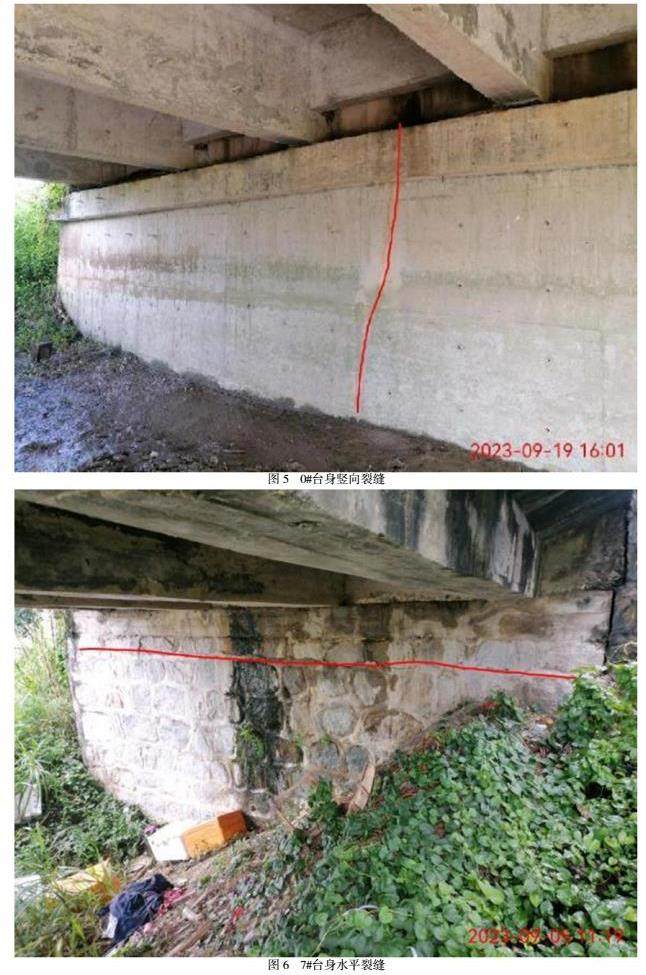 桥台同样面临类似的病害挑战。重力式桥台可能因基础竖向不均匀沉降和混凝土收缩、温缩等因素,产生竖向或斜向裂缝。桥台渗水也是常见问题,主要由伸缩缝漏水或梁端缝防水处理不当引起,导致雨水下渗并长青苔。其中,0#台身竖向裂缝(图5)和7#台身水平裂缝(图6)尤为显著。