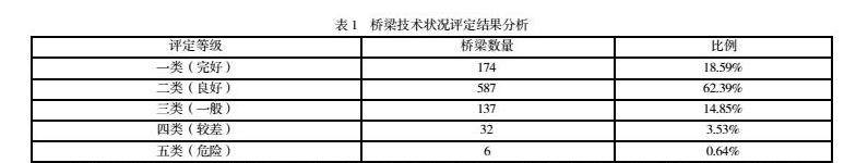 以下是本次桥梁技术状况评定的结果分析,详情如表1所示: