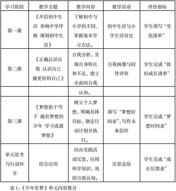 教师整合《少年有梦》单元课程内容,使学生在逐步深入的学习过程中建立系统认知。每个学习阶段层层递进,保证学生对各个知识点形成深刻理解,形成完整的成长框架,培养其自我管理能力。