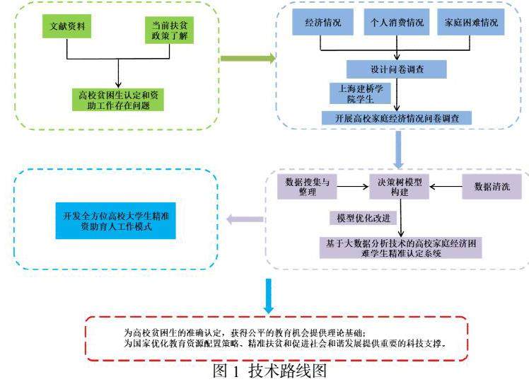 鉴于高校经济困难家庭学生精准认定研究的迫切需求,项目拟结合历史文献资料和当前高校扶贫工作现状,基于大数据分析技术,提出问题解决思路。首先,通过历史文献资料和当前高校贫困生认定现状了解高校经济困难家庭学生认定和资助工作中存在的主要问题。其次,关于经济情况、个人消费情况、家庭困难情况的调查问卷,以上海建桥学院为对象开展问卷调查,并整理分析问卷结果,去除不符合项。然后,基于大数据分析技术(决策树模型)对数据进行分析,构建高校家庭经济困难学生精准认定系统。在此基础上,对系统预测能力进行验证、改进和优化以准确确定高校学生是否为贫困生,完成高校大学生精准资助育人工作模式的开发。