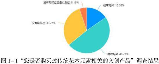 首先,针对“是否购买过含有传统花木元素相关的文创产品”的问题,参与者在购买此类文创产品方面呈现出显著的层次性。见图1- 1所示,48.72%的参与者偶尔购买,15.38%的参与者经常购买;相对地,30.77%的参与者表示未曾购买,5.13%的参与者虽有接受但未主动购买。这表明超过半数的参与者曾经购买过含有传统花木元素的文化创意产品,然而,仍有超过35%的参与者未曾购买过此类产品。基于进一步的调查分析,我们认为这主要是由于目前市场上传统花木元素的文创产品存在以下问题。