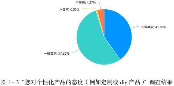 在当前市场环境下,众多文化创意产品依然沿袭传统的直销模式。在此模式架构内,消费者的角色通常被限制在选择商品、完成交易及支付款项等基础交易环节。此类交易行为仅触及消费行为的表层,未能深入消费体验的核心层面。因此,消费者在实际消费过程中,并未充分体验到产品及服务所承载的丰富文化内涵与精神价值。此现象可能致使消费者购买文化旅游产品的初衷,仅限于证明自身曾经的到访,而未能真正触及消费者内心更深层的情感需求与精神追求。见图1- 3我们发现绝大多数参与者对个性化产品持积极态度,这表明个性化产品在消费者心中具有显著的重要性与吸引力。仅有0.85%的受访者表示不感兴趣,而4.27%的人表示对此类产品持中立态度,这进一步凸显了个性化产品的巨大市场潜力。