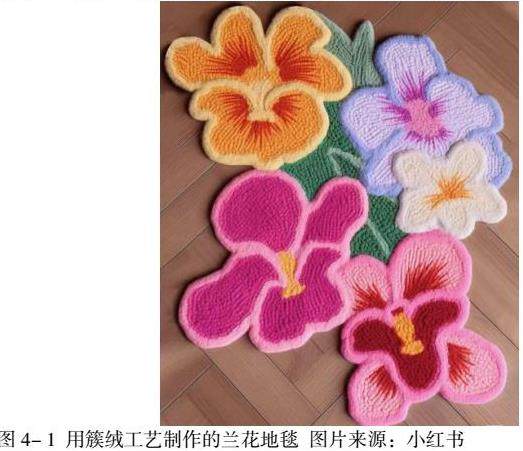在探讨中国传统花卉元素在簇绒产品设计中的应用与体现时,本研究提出了一种结构化设计方法。该方法的核心在于向消费者提供半成品或材料包,不仅预留了消费者参与手工制作的空间,而且使他们能够体验独特的手工制作过程。例如,手工戳戳绣技术,一种允许消费者利用木戳针和毛线在绣布上创作具有立体感图案的技艺。通过此方式,消费者能够亲手制作出各类装饰品,如杯垫、地毯、挂画等。如图4- 1所示,通过簇绒工艺制作的兰花图案地毯,既具美观性又具实用性。消费者可选择购买商家预先搭配的材料包,其中包含具有中国传统花卉图案元素,如梅兰竹菊等。通过此方式,消费者能够制作出既蕴含深厚文化内涵又具有实际使用价值的簇绒产品,从而在享受手工制作乐趣的同时,也能够领略中国传统文化的独特魅力。