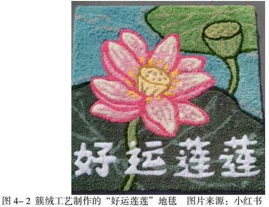 相较于通过大规模生产方式制造的工业化商品,文化创意产品因其独特的文化内涵和创意设计,为消费者提供了更为丰富多彩和多元化的消费体验[7]。这一点在手工簇绒产品与现代化机器植绒制品的对比中尤为显著。手工簇绒产品以其更高的灵活性和多样性,能够根据消费者的具体需求,提供量身定制的服务。在手工簇绒产品的个性化设计过程中,消费者被鼓励全程参与,这包括了图案设计、材质选择、色彩搭配以及细节处理等多个关键环节。消费者需要充分表达自己的个人诉求,以确保其个性化需求能够得到最大程度的满足和体现。如图图4- 2所示,该地毯为消费者自行设计,采用簇绒工艺制作而成,名为“好运莲莲”。手工簇绒产品的设计范畴非常广泛,它具备了强大的开发潜力,能够生产出各种各样的产品,如互动性装置艺术、苔藓地毯、簇绒绘画、装饰品等。在图案的呈现手法上,手工簇绒产品也表现得非常多样,它常常会结合钩编、刺绣等传统工艺,这样的结合不仅丰富了产品的表现形式,也进一步提升了消费者的体验。