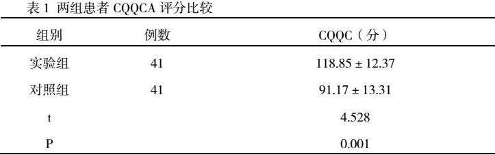 2、结果:表1显示,实施基于微信的心脏康复延续性护理,实验组患者的CQQC问卷评分明显高于对照组,有统计学意义(P>0.05)。